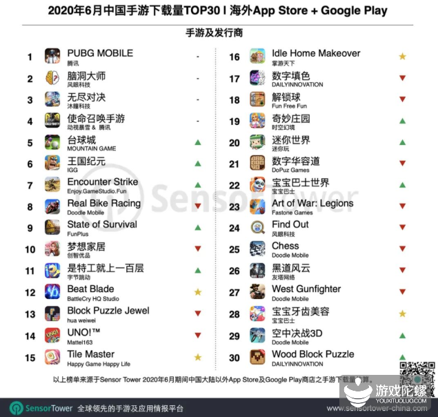 虽然Apple Search Ads只是买量投放的其中一环,但其对于一款移动游戏的成功也起着非常重要的作用。《Pooking-Billards City》虽然知名度并不甚高,但早在2018年就是出海下载TOP产品中的常客。根军Sensor Tower发布的2020年6月中国手游下载量TOP30榜单显示,《Pooking-Billards City》(台球城)排名第5,甚至领先于《王国纪元》、《黑道风云》等知名产品。而由本次观察结果可以推测出的是,对Apple Search Ads的重视,是《Pooking-Billards City》最终走向成功的重要因素之一。