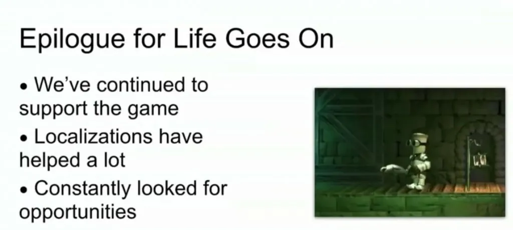 回到我们的游戏,我们对《Life Goes On》的支持一直没有断过,而且通过本地化取得了一些成绩,尤其是亚洲市场。幸运的是,我们游戏里的文字很少,所以本地化成本不高。虽然从未成为大作,但与发布时相比,我们的表现越来越好了。