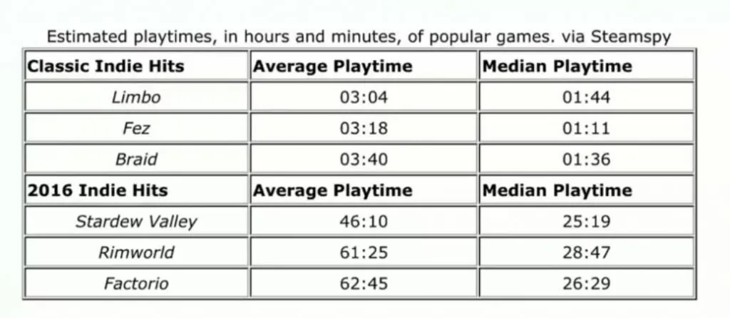 而且,如果与之前的经典独立游戏大作《地狱边境》、《菲斯》、《时空幻境》等对比,你会发现人们现在的习惯改变了很多,他们在《星露谷物语》、《环世界》、《异星工厂》等游戏的平均时间和中位数时间都是此前的数十倍。