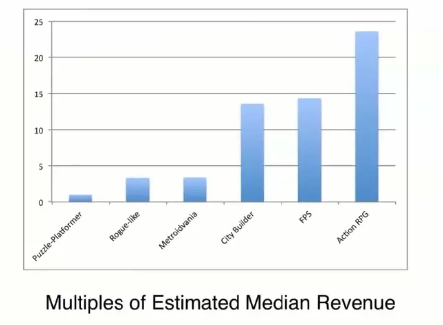 如果按照品类对比游戏收入中位数,你可以明显发行,动作RPG的中位数是平台解谜游戏的24倍之多,而比较受独立开发者青睐的Roguelike、银河恶魔城类游戏,它们的收入中位数只是平台解谜游戏的三至四倍,因此我们可以看出,不同的品类有着完全不同的市场反应。