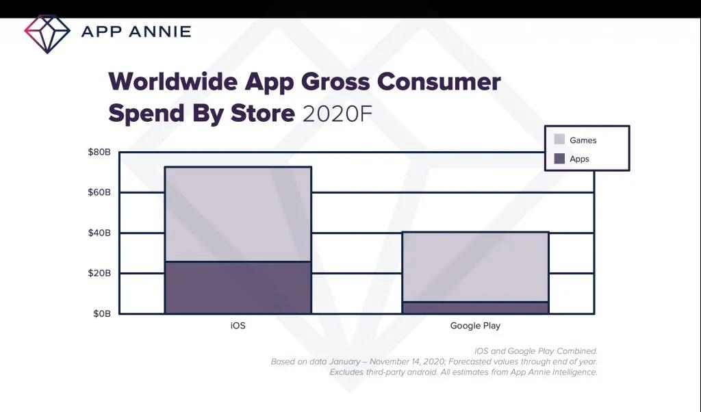 据App Annie最近发布的《2020年度回顾与展望》报告显示,2020年全球iOS和Google Play应用总收入将超过1120亿美元,同比增幅25%,其中800亿美元来自手游,占比接近72%。从平台来看,iOS手游收入520亿美元,占双平台游戏总收入的65%,Google Play手游收入同比增长30%,达到280亿美元,占比为35%。