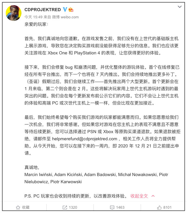 开发商同时也做出承诺,在接下来的一周时间里(12月21日之前),主机玩家可以在对应平台上申请无条件退款。如果退款被拒,人们可以向 CDRP 发邮件寻求协助。