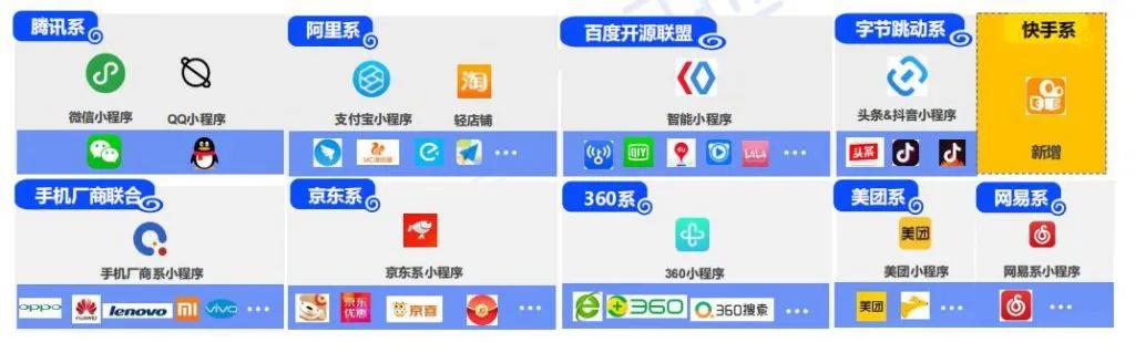 自2020年10月快手正式开放小程序内测,布局小程序生态后,如今小程序平台系已形成腾讯系、阿里系、字节跳动系等为首的十大系12种小程序。