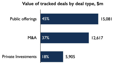 其中,公募(Public Offerings)在经历了第一季度近乎停滞后,出现反弹,第二季度交易额达到46亿美元,全年实现近151亿美元的规模,其中IPO 18笔,规模达到28亿美元,包括Unity、Skillz和Kakao Games在内公司成功上市。