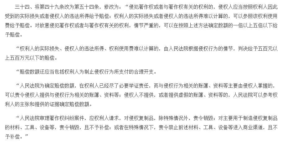 2020年11月11日,十三届全国人大常委会第二十三次会议表决通过了关于修改著作权法的决定。针对著作权维权“得不偿失”的现象,新修改的著作权法规定了一系列惩罚措施,大幅提高了侵权成本:“对故意侵犯著作权或者与著作权有关的权利,情节严重的,可以适用赔偿数额一倍以上五倍以下的惩罚性赔偿。”