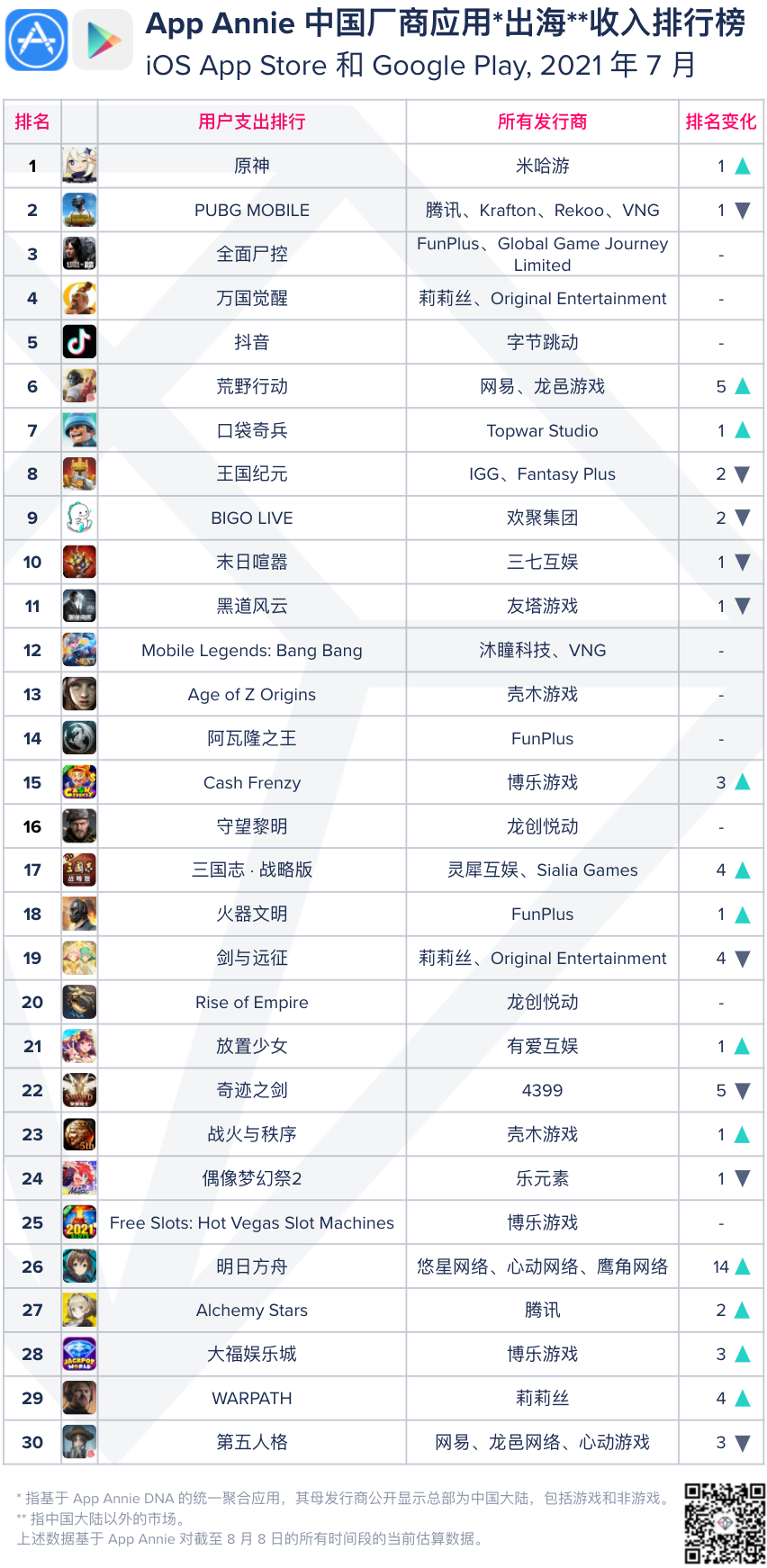 近日,App Annie发布了2021 年 7 月中国厂商及应用出海收入排行榜。本次榜单尾部厂商排名变动较大,可看出7月出海厂商竞争依旧激烈。