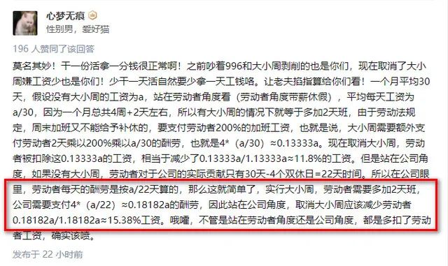 有微博网友表示“这不是正常的吗,你的工作时间减少了,周末不加班了,周末加班费就取消了呀”,这也代表了“正常派”的看法,知乎网友“心梦无痕”甚至用数学算出了取消大小周,“站在公司角度,取消大小周应该减少劳动者0.18182a/1.18182a≈15.38%工资”。
