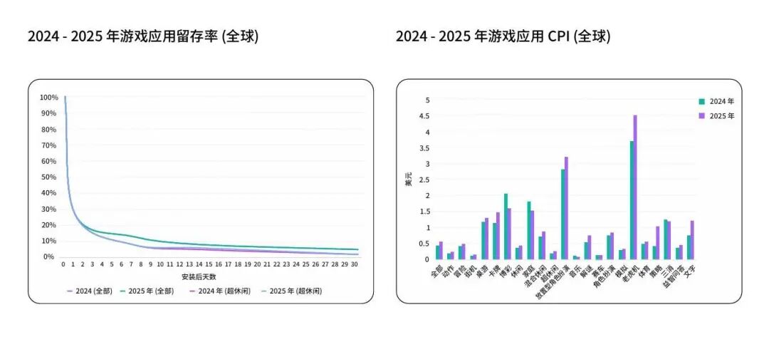 虽然大盘稳中有进,但游戏行业正在经历高强度的军备竞赛,这一点从成本数据就能看出来。报告指出,2025年全球游戏应用的单次安装成本暴涨30%,达到0.56美元。