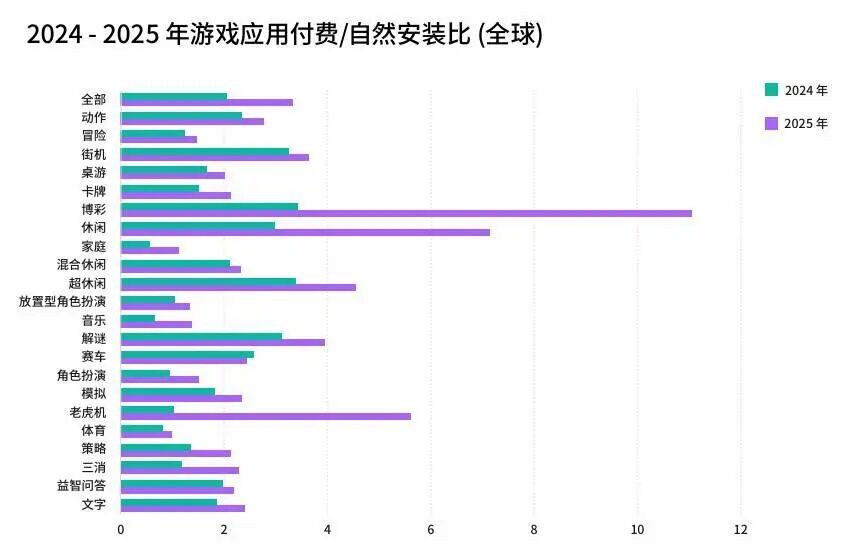2025年,全球游戏应用的整体付费安装和自然安装的比例激增61%,这意味着,如今每获得1个自然用户,同期就会有超过3个用户来自付费渠道。博彩、休闲和策略类游戏的比值最为极端,倒是也符合品类特点。