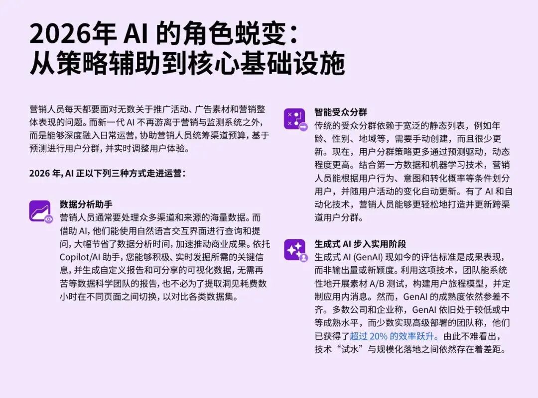2024 年,AI还是营销人口中的黑科技噱头。到了2026年,它已经变成不可或缺的生产力底座。行业进化表明,AI不再仅仅是帮你写个文案,而是介入到了营销的骨髓里。报告里提炼出的三个关键落地场景,每一个都直接关系到效率。