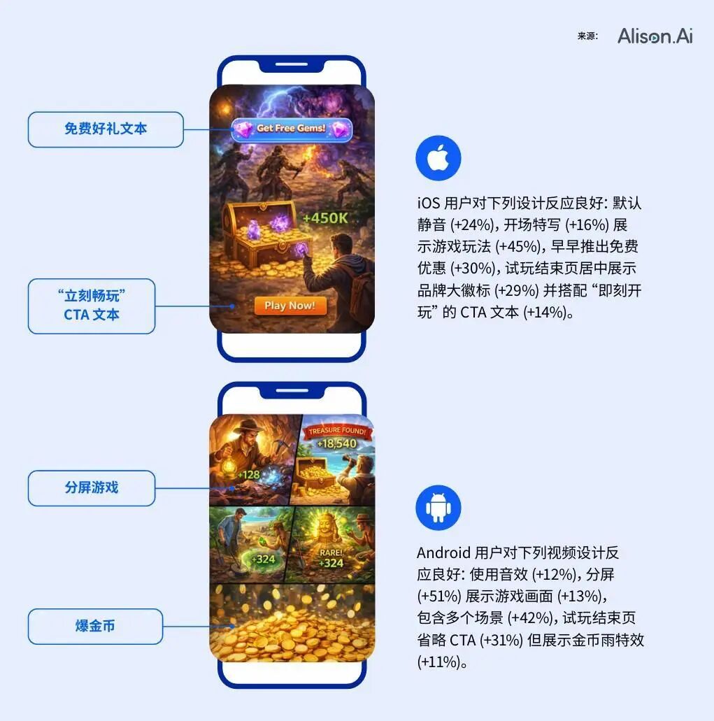 最后,素材策略也在变。一套素材打天下的时代结束,针对iOS和安卓系统在音效、按钮和开场画面上的差异化定制,已经成为提升转化的标配。报告里提到,成功的团队会把素材元素拆到很细,不同操作系统、不同地区、不同用户群体,用的素材都不一样。