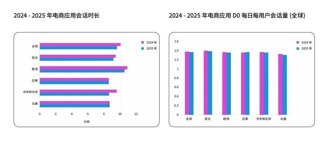 电商领域出现了一个有趣现象:安装量下跌10%,但会话量逆势上涨5%。同时平均会话时长从10.04分钟微降到9.6分钟。