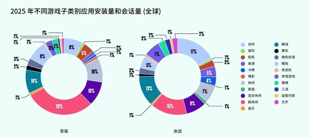 总的来说,休闲游戏的表现是个意外亮点。2025年安装量劲增19%,会话量跃升37%,在经济下行周期展现出很强的韧性。这说明轻决策、高频次的内容,在用户时间碎片化的背景下反而更有优势。