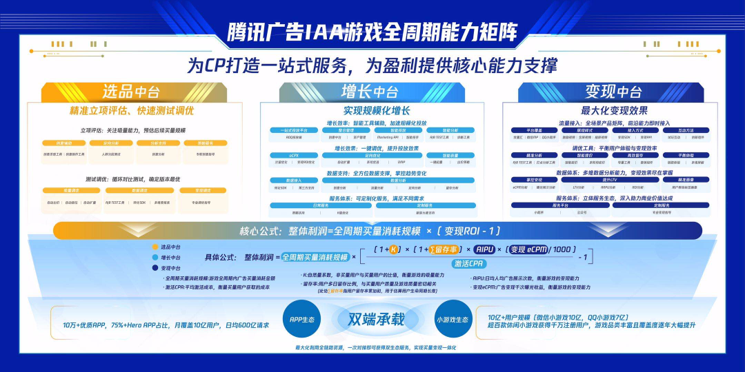 对此,腾讯广告整合各项能力,打造“选品中台、增长中台、变现中台”三大一站式能力中台,助力IAA游戏CP与发行各方在“立项选品—测试调优—买量变现”全周期中实现供需连接的打通和全周期调优,以提升各项关键指标,最终带动IAA游戏在全生命周期中的整体增长。
