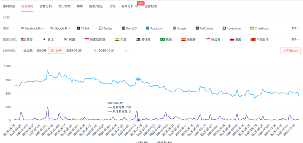 投放方面,根据Dataeye ADX显示,《Bid Master》近180日的素材有所减少,但新增素材大多维持7日1迭代的形式。换句话说,《Bid Master》在投放上虽然看似逐步减弱,但实际上更着重素材的吸量效果,并进行有效替换。