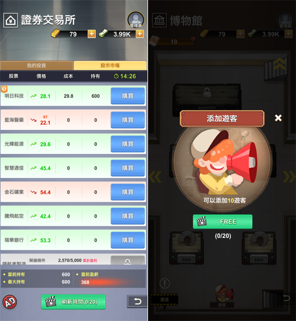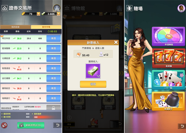 单玩法设计上,这些子玩法的难度与玩家的真实世界具有较高的应景度,通过合适的难度提升玩家对这些玩法的印象力。比如玩家在首日股市交易内可能见到的探底价格,在次日或第三日甚至可能出现继续探底现象。同样,上升现象时,也可能连续持续走高;比如收租侧,玩家投入数千资金,但需要玩家通过IAA招募租客,每轮租客提供的钞票又十分少量。