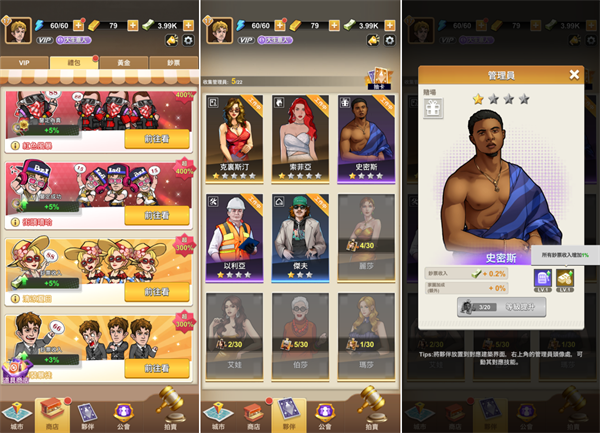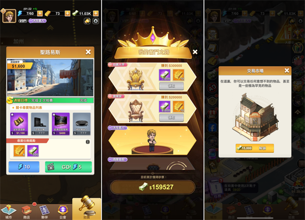 本质上,《Bid Master》属于大亨类模拟经营游戏,多元经营是游戏品类的核心。多元经营的体现,则是营收方式的多元化。在《Bid Master》的模拟经营玩法内,设计了博彩、收租、门票、股票、淘宝、挖矿、废物回收、汽车拼装、探险等9~11个营收场景,营收场景对应风险投资、实业、收藏等多元且不同风险级别的资源营收模式。这些玩法及营收模式既完整地填充了资源投产的类型、形式,同时核心玩法的流畅性设计,驱动了玩家对众多子玩法的体验、时间投入。