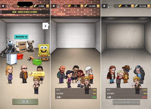 竞拍过程中,竞拍品对玩家属于“理想成本”属性;竞拍品被玩家拍下并成功恢复后,对玩家则属于“理想价格”属性。为了便于理解,可将竞拍品简单理解为宝可梦游戏内,野生状态下的宝可梦实力,与被玩家捕获后的宝可梦初始实力。单关卡分布上,每个关卡拥有2~3个仓库竞拍,单仓库竞拍品最低数十钞票,高则可达一两千钞票,前一轮仓库出现过的部分竞拍品可以在下一轮继续出现。也就是说,玩家在闯关的难度具有较高的上浮空间。