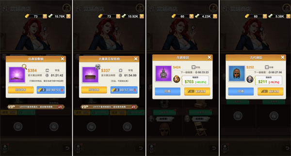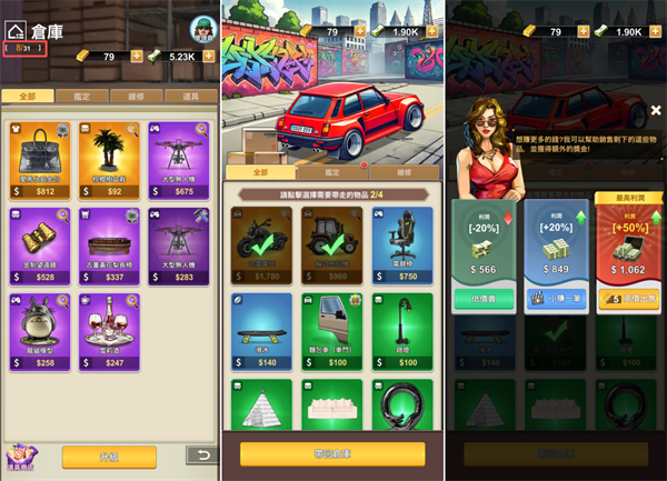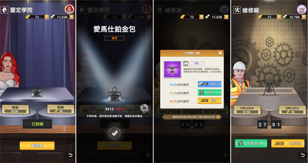 《Bid Master》在竞拍商品分为种类与状态两类目。种类划定了商品归类,以及后续可应用场景,与模拟经营玩法实现挂钩;而状态分为部件、收藏、鉴定、维修4种,状态决定商品售出的理想价格。玩家若想将高价值商品,实现“真实价格=理想价格”,则需要花费游戏内的钞票,进行鉴定、维修等环节。《Bid Master》无论是鉴定,还是维修,商品拥有较高的“恢复价值失败”概率。玩家失败次数越多,付出成本越高。但对应地,高价值商品的“理想价值”,往往为“真实价值”的3倍。