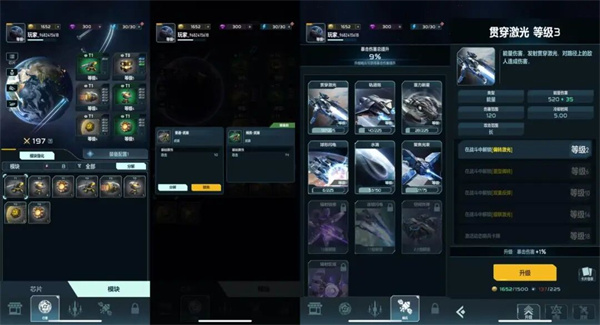 养成方面则分为行星和哨兵两部分。行星可以视为主角/人物养成,可以安装模块(装备)、为模块镶嵌各种芯片(宝石),芯片可以提供多种加成,如生命值、减伤、提升武器攻击力等。面对不同的敌人,选择合适的模块、芯片装配,可以达到事半功倍的效果。