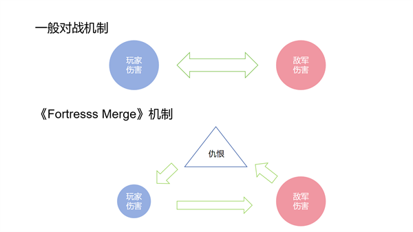 同样,另一个镜像表现,在单位生成机制及数量。《Fortress Merge》敌方部队单波出现数量大,且具有续兵性,而玩家的部队需要显著的生产时间,部队无法“以量取胜”。游戏内,消灭敌军所需时间作为输出放大器,敌军的“建筑——近战单位——远程单位”的仇恨逻辑,让玩家提供了时间与空间。仇恨机制作为PvP属性属于常规设定,但由于《Fortress Merge》的单位生成数量规模与敌军具有较大落差,从而让仇恨机制成为玩家着重利用的重要战术元素。