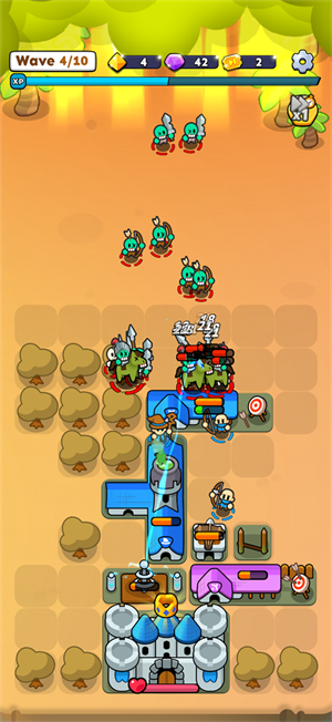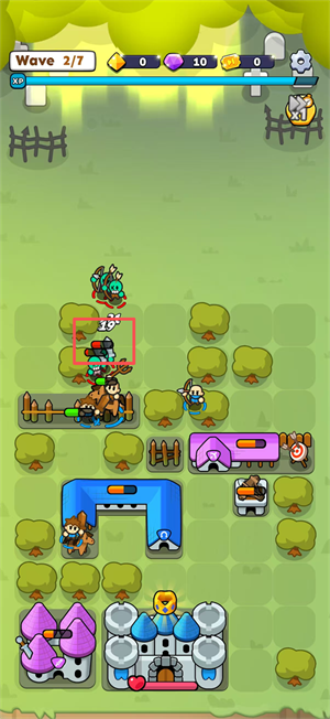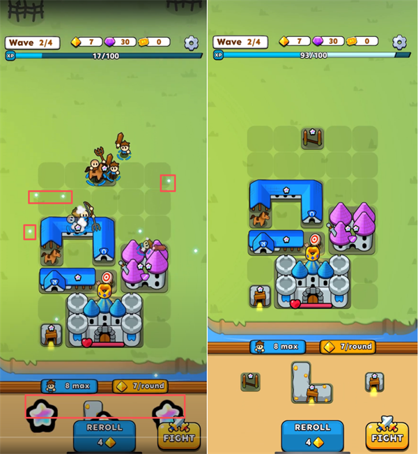 《Fortress Merge》先将棋盘规模提升,通过建筑外形,与棋盘格细致分类的方式,形成了路径规划塔防品类的规划性。