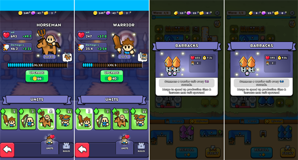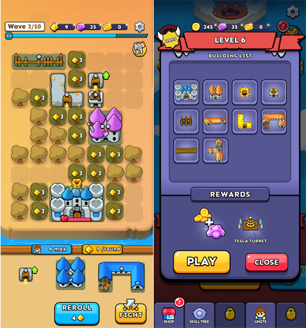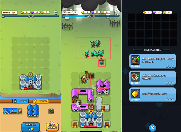 从第2关开始,地图提供更大的棋盘,更多的部队建筑,以及肉鸽技能。此阶段的扩展,《Fortress Merge》围绕的是对玩家玩法拓展内容:提升部队、建筑空间支配。与之同时,游戏特质对玩家进行传递:
