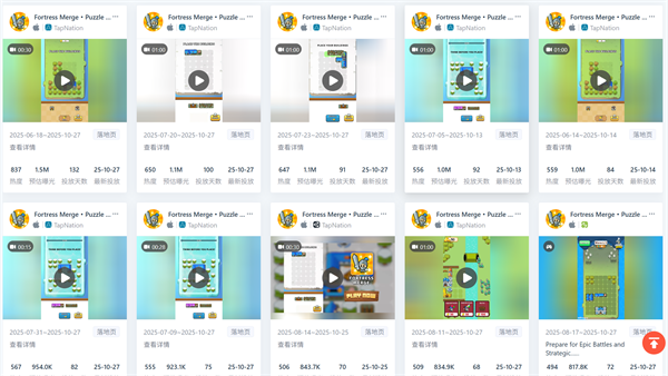 投放方面,《Fortress Merge》出现仅4条曝光量到达百万级视频,均以实机视频为主,通过曝光部队的血量大幅度领先敌军,用少量单位成功防守为核心。整体来看,《Fortress Merge》投放依然有一定的提升空间,如展示单位的高频攻击,或是敌军数量的海量等方式。