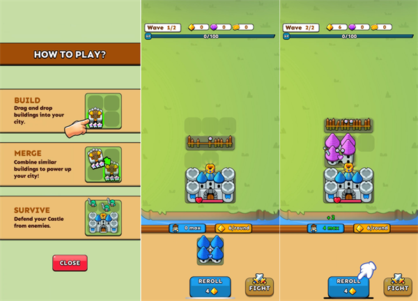 在开局上,《Fortress Merge》提供简洁明了的游戏指引提示,初期游戏关卡十分简单,将玩家所需要的基础游戏交互:生成建筑、摆放建筑、二次生成、点击战斗,4点很好地呈现。初期熟悉度仅通过2波战斗完成,降低了玩家首次体验的时间成本。