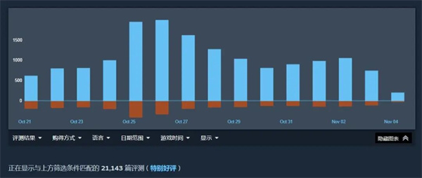 但游戏中文区评价只有500个,占总体评价数量不足3%,且口碑呈现出另一种分化。主要是吐槽游戏尚未支持简体中文,键位不能自定义,联机时偶尔会掉线。