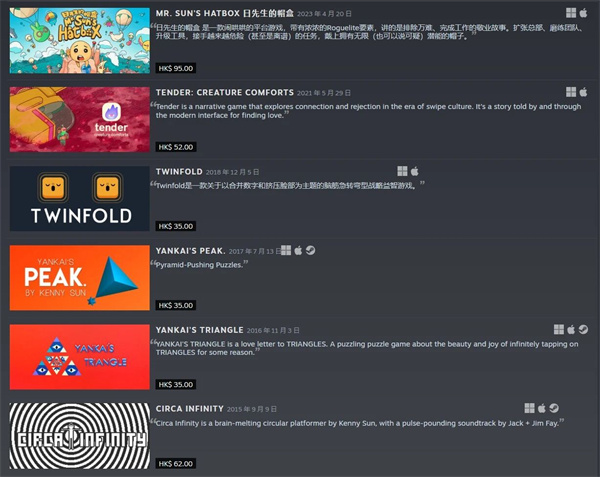 主创Kenny Sun曾是典型的实验型独立开发者,早期作品如《Circa Infinity》《Yankai’s Peak》《Tender》都以极简几何视觉和循环节奏著称。更像艺术实验,而非大众娱乐。