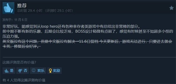 媒体普遍认为游戏的中后期深度有限,重复度较高。大多数玩家在体验20小时后就基本通关。商店页出现了典型的评论:“很爽,但玩不久。”