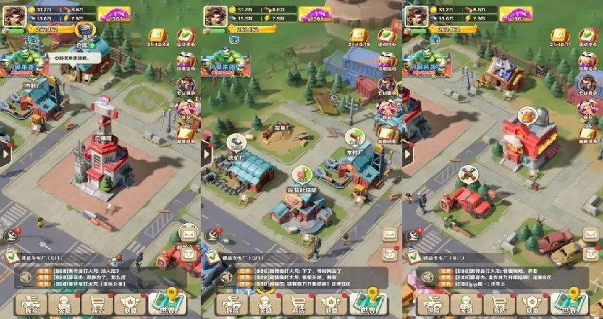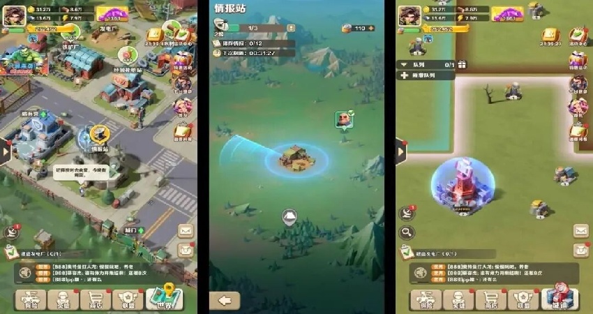 探索后的地块,可以建造更多新的功能性建筑,例如联盟大厅、幸存者小屋、商店等。当完成“情报站”的建设后,解锁了大地图功能,游戏的SLG玩法也就展露无疑了。