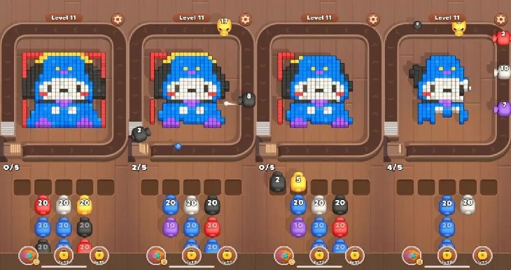 点击炮台可以将其放入履带,履带围绕方块进行移动。当炮台的颜色与最外层方块颜色相同时,会自动发射子弹进行消除。移动一圈后,若还有剩余子弹,炮台会进入储存槽。储存槽中的炮台可以多次上场,直到子弹耗尽。储存槽默认有5个位置,超过上限后关卡失败。当场上所有方块消除完毕后,关卡挑战成功。