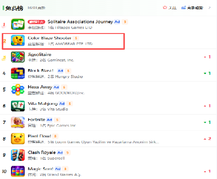 在全球市场方面,截至2日下午,《Color Blaze Shooter》在全球8个国家和地区排名免费榜第1,共计61个国家和地区排名前10。