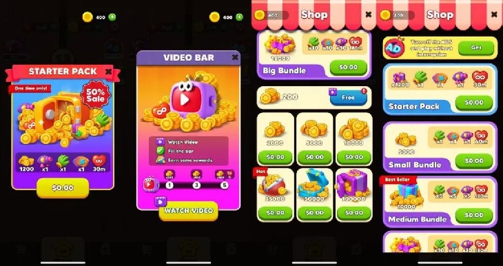 变现方面,游戏采用混合变现模式,激励视频点位包括关卡奖励翻倍、免费金币、免费体力。内购包括金币购买、多种礼包、取消广告等。