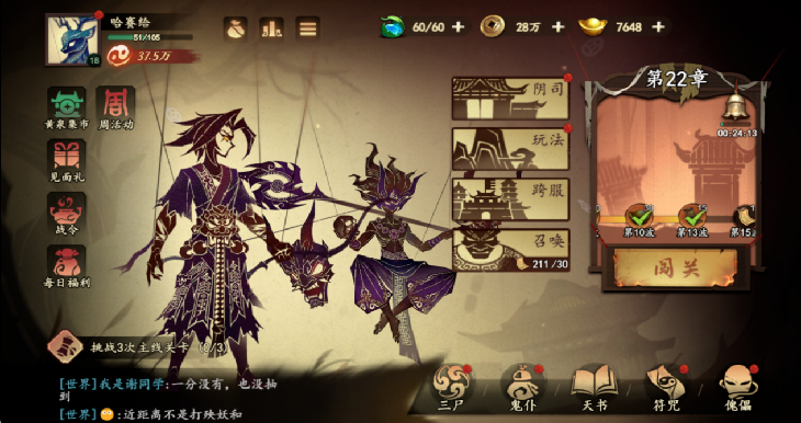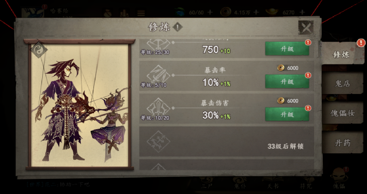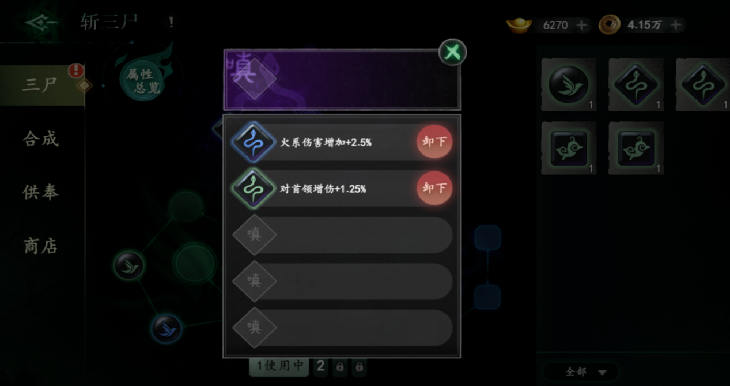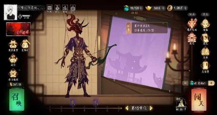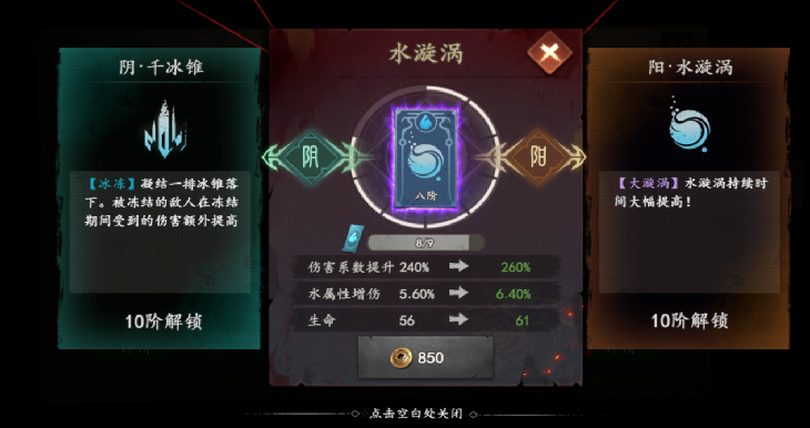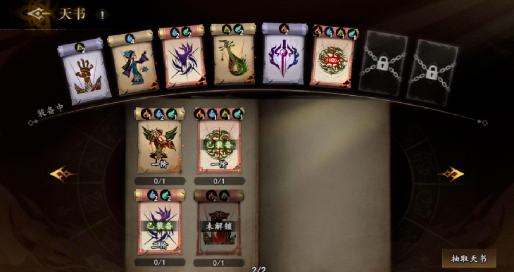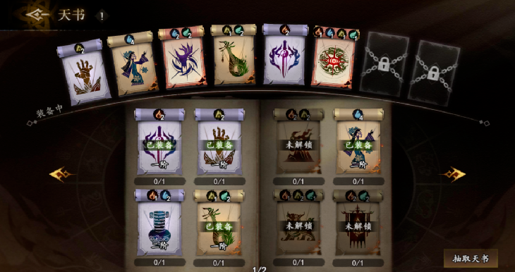 如同前文所说《遗弃之地》的第一阶段是“打牌感”,玩家此时的驱动则是养成符咒及天书。玩家前期抽取符咒及天书后,消耗铜钱及对应本体进行升级,玩家将符咒升至10级之后就会分为阴阳两类,对应机制也不同,形成第一环的局外构筑。同时,每个符咒拆分升级,降低一次性投入资源的庞大感官。