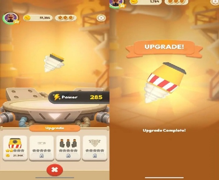 获得的金币可以用于强化钻头,共有4个强化项,每项都可以提升钻头的伤害。每个项目强化之满级后,可以改变钻头的外形,并且解锁无尽强化按钮,可以消耗金币继续强化钻头。