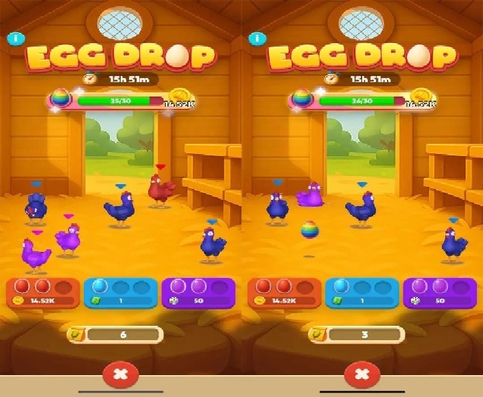 游戏中还有一个三消模式的孵化场小游戏。通过日常游戏获得“饲料”道具后,可以在孵化场点击各种颜色的小鸡,点击后有概率获得对应颜色的蛋,以及彩色的蛋。相同颜色的蛋会放入消除槽,满足三个可以获得奖励。彩色的蛋则是另一个栏位,满足数量要求也可以获得奖励。