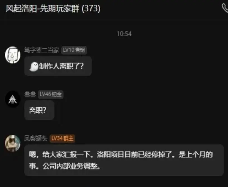 2024 年6 月12日,游戏官网和玩家群里确认:由于公司内部业务调整,暂时没有收益的单机项目全部下马,《风起洛阳》停止开发,项目组人员全部离职。
