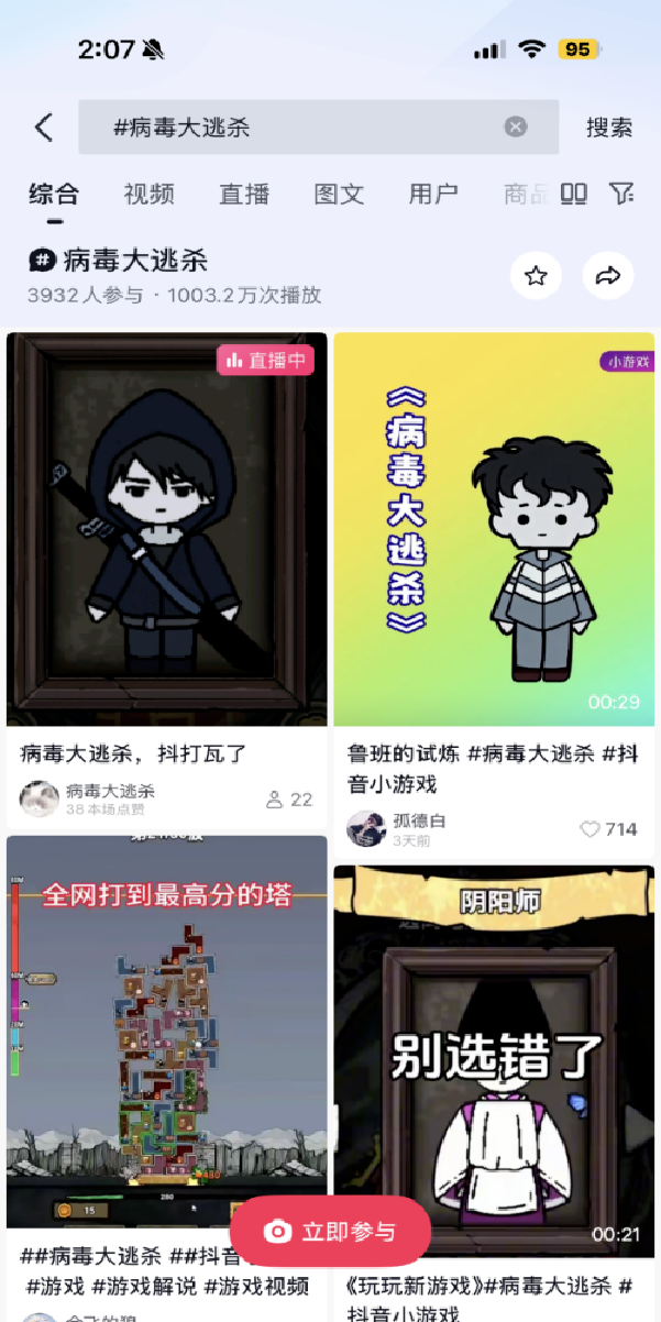根据Dataeye数据显示,《病毒大逃杀》买量投放规模整体较小,但在抖音平台相关话题的播放量却相当可观,也有不少的达人进行游戏直播。