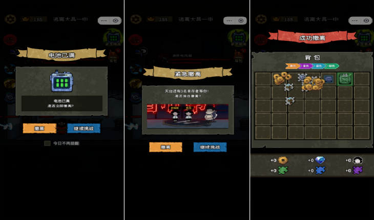 第三种撤,是游戏的提前撤离设计。玩家在关卡内凑齐6块电池,游戏会询问玩家是否提前撤出游戏。若玩家提前撤离,则营救幸存者失败,但会带走当前在关卡内搜集的物资。从单一设定来看,《病毒大逃杀》提供一个玩家提前结束游戏的方式,提升玩家的二次通关效率,看似较为单调。《病毒大逃杀》的养成系统内,围绕“幸存者数量”进行设计。局外养成玩法及游戏进度,均需要玩家达成营救数量方可实现。提前撤离设计也是《病毒大逃杀》的另一个点睛之笔的存在:若玩家提前撤出,虽然游戏资产成功带出游戏局外,玩家不需要观看IAA广告,形成局内局外养成联动,但养成架构、游戏进度无法推进;若完整对局,玩家必然存在各阶段需要观看广告的风险节点。