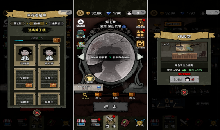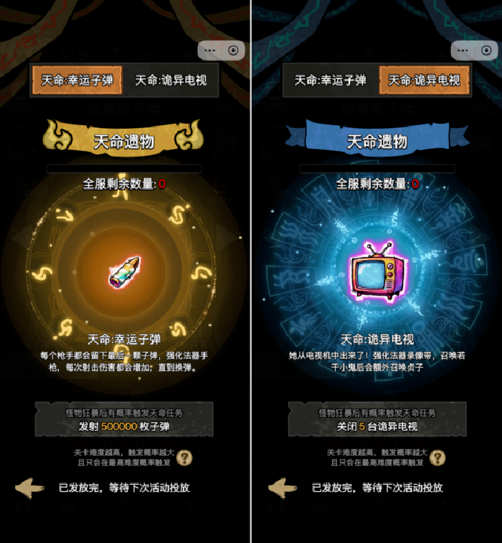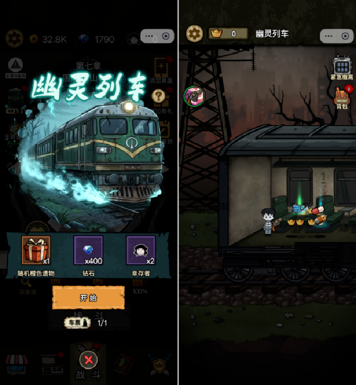 第一个主玩法为“幽灵列车”,挑战次数需要玩家在核心玩法打出“车票”实现,掉落幸存者数量以及用于强化肉鸽技能机制的遗物。玩法上偏向横排实时爬塔玩法,玩家可以借助游戏地形及前面已通关的场景、道具。