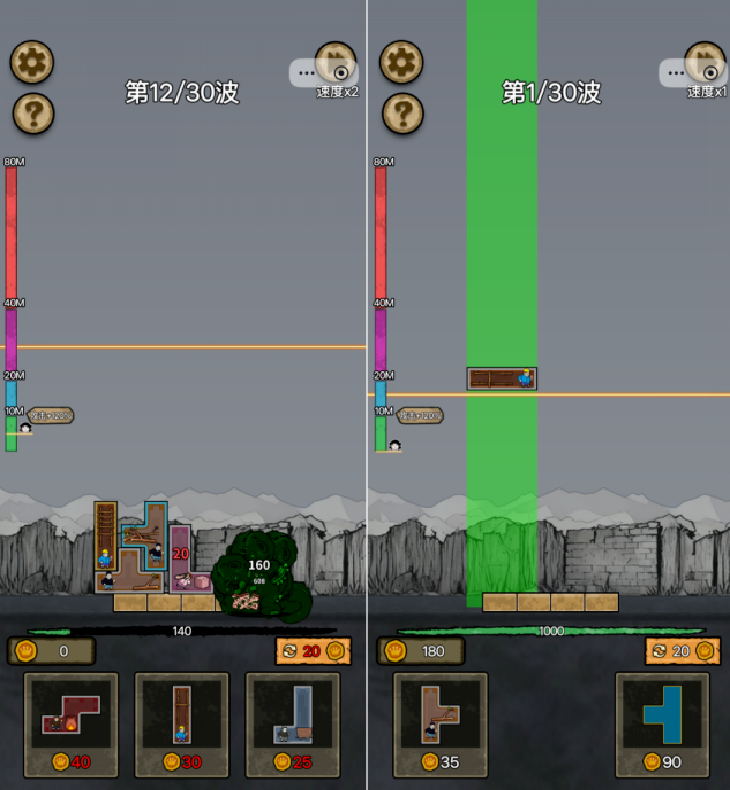 第二个主玩法则是中心塔防、盖房子玩法与俄罗斯方块结合,玩家通过手动的方式下落摆放俄罗斯方块外形的塔,抵御30波怪物。每次防御成功会提供玩家一定的金币进行构筑、强化,两个相同外形、相同方位的方块会实现合成,摆放过程时玩家需要注意俄罗斯方块不会掉落。