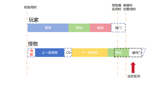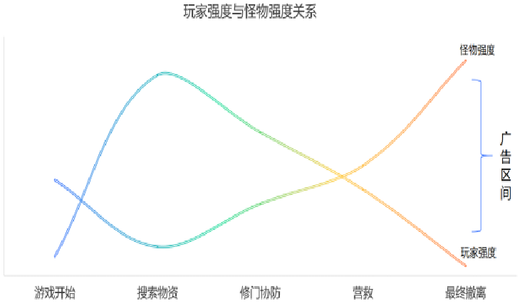 由于门只作为延缓怪物与玩家身处同一场景的存在,在玩家攻击Boss期间,玩家受到怪物与Boss的双重消耗,血量需要回复道具延缓时间。前面空间的门被怪物破坏之后,变相限制了玩家的回复使用,让玩家陷入进一步劣势。此时,玩家在游戏内调用的一切资源属于有限形式存在,玩家强度与怪物的强度差距导致挑战失败,最终成为主要的广告埋点。