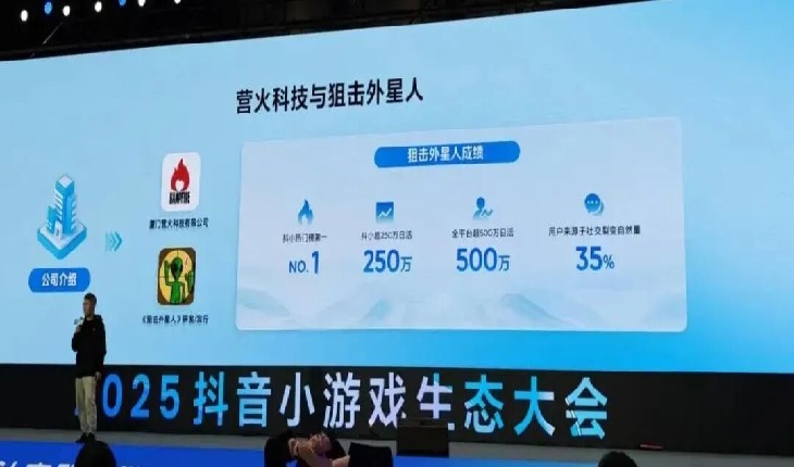 营火科技位于厦门,以研发为主,专注于益智、消除类休闲游戏。《狙击外星人》是我们第一款自研自发的产品,曾登上抖音小游戏榜榜首,单平台最高日活达到250万,全平台最高日活突破500万。其中,35%的用户来自社交裂变。
