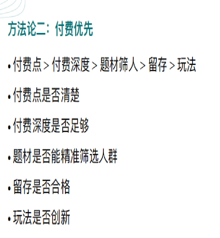 这意味着,付费点设计与付费深度研究变得至关重要。例如,现在小游戏平台上跑得较好的重度SLG游戏,相比APP版本,往往将付费点明显前置(比如首充设计)。对于买量型游戏而言,付费点与付费深度的设计,其重要性甚至超过玩法与流程。我们需要关注: