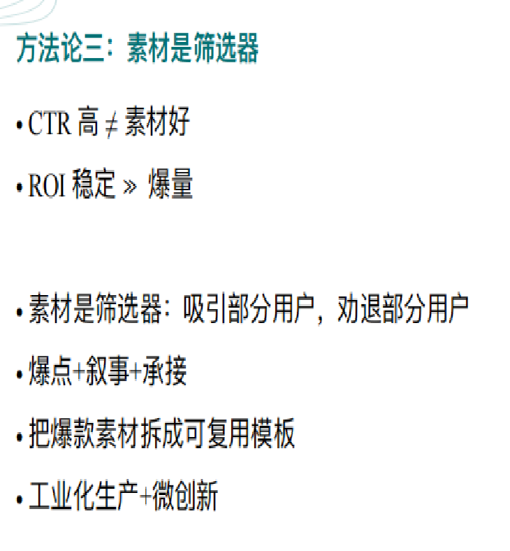 所谓“素材是筛选器”,是指它应能吸引目标用户、劝退非目标用户,本质上是一种新的定向方式。我们总结了一个三层素材方法论: