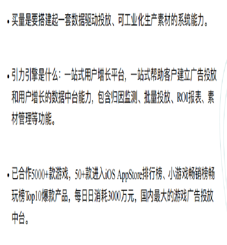 最后简单介绍一下引力引擎。引力引擎是一个一站式用户增长平台,为客户提供广告投放与用户增长的数据中台能力,包括归因、批量投放、ROI报表、素材管理等功能。目前已合作超5000款游戏,其中50多款曾进入各平台畅销/畅玩榜Top10,每日协助客户管理消耗超过3000万,是国内最大的游戏投放中台服务商。