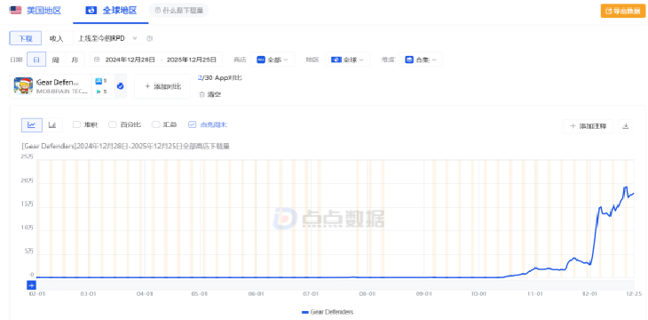 近期,由MobiBrain发行的《Gear Defenders》在海外表现出色。根据点点数据显示,《Gear Defenders》近30日下载量高达360万,《Gear Defenders》自身在今年2月份首次海外上架,7月份在国内发行《转就完了》《旋转英雄》两款同包游戏,海外产品《Gear Defenders》在11月前下载量并无明显增长,从12月1日起游戏下载量迎来爆发式增长。